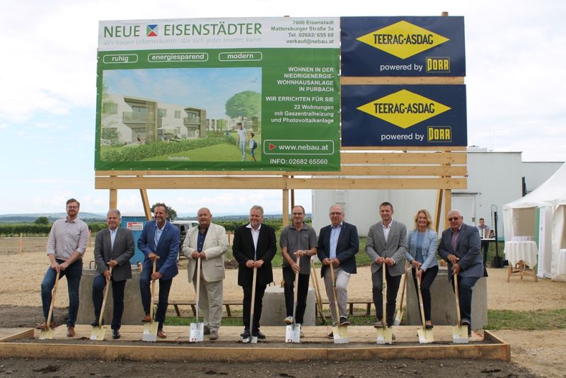 In Purbach erfolgte der Spatenstich des ersten Bauabschnitts für eine neue Wohn- und Reihenhausanlage. Der erste Bauabschnitt des Projekts beinhaltet 22 Wohnungen und zwölf Reihenhäuser. In den kommenden Bauabschnitten sollen weitere 24 Wohnungen und 28 Reihenhäuser entstehen. Die unterkellerten Reihenhäuser umfassen eine Größe von 104 m2 und inkludieren einen privaten Garten mit Gartenhütte. Die 2- bis 3-Zimmer-Wohnungen im Obergeschoß verfügen über einen privaten Balkon, während jene im Erdgeschoß einen eigenen Garten zwischen 40 m2 bis 100 m2 besitzen.