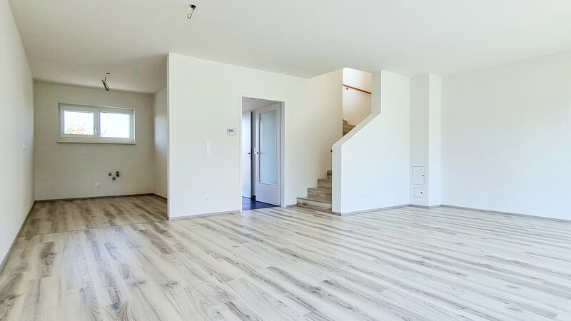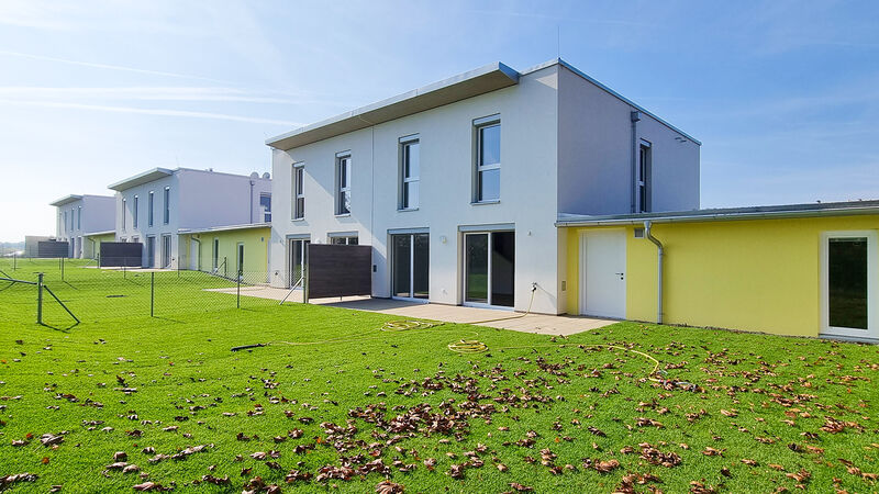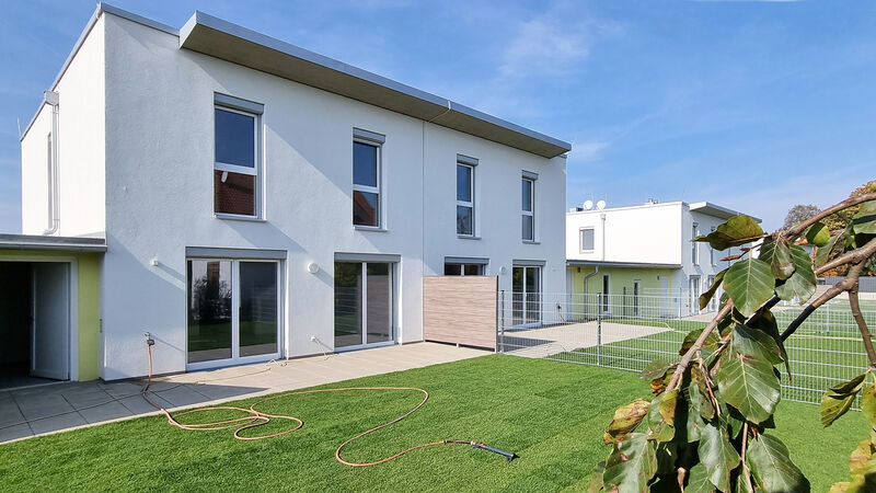 Die modernen Doppelhäuser wurden in schöner Grünruhelage erbaut und verfügen über eine Wohnfläche von etwa 113 m2, aufgeteilt auf zwei Geschoße. Im Erdgeschoß befinden sich die offene Küche und der großzügige Wohnraum mit anschließender Terrasse und Garten. Schlafzimmer, zwei Kinderzimmer und das Badezimmer sind im Obergeschoß angeordnet. Jedes Haus verfügt über einen geräumigen Kellerersatzraum sowie zwei Carport-Stellplätze.
