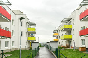 Die Außenanlage der Siedlung wurde gärtnerisch gestaltet und Kinder können sich über einen Spielplatz freuen.