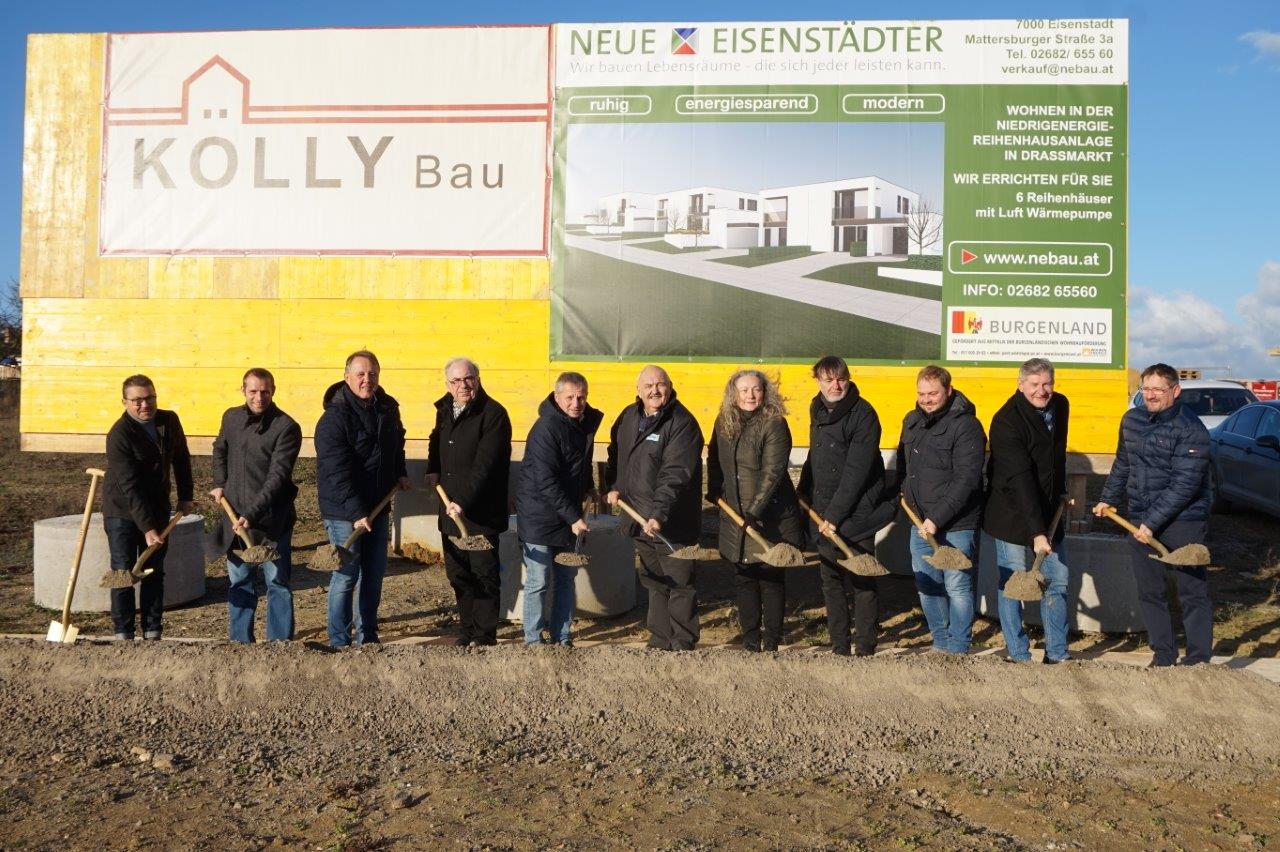 Mitte Dezember fand in Draßmarkt der Spatenstich zu einer neuen Reihenhausanlage statt, über die sich die neuen Bewohnerinnen und Bewohner 2021 freuen dürfen. Mit dabei war Bürgermeister Anton Wiedenhofer sowie zahlreiche Gemeindevertreter und Professionisten. Das Wohnprojekt zeichnet sich durch seine moderne Architektur und Niedrigenergiebauweise aus. Die Reihenhäuser verfügen über eine Wohnnutzfläche von 114m2 mit drei Schlafzimmern und einer Wohn- und Esslandschaft. Der eigene Garten lädt dazu ein, die Sommertage im Freien zu verbringen. Jedem Haus wird außerdem ein überdachter PKW-Stellplatz zugeteilt.
