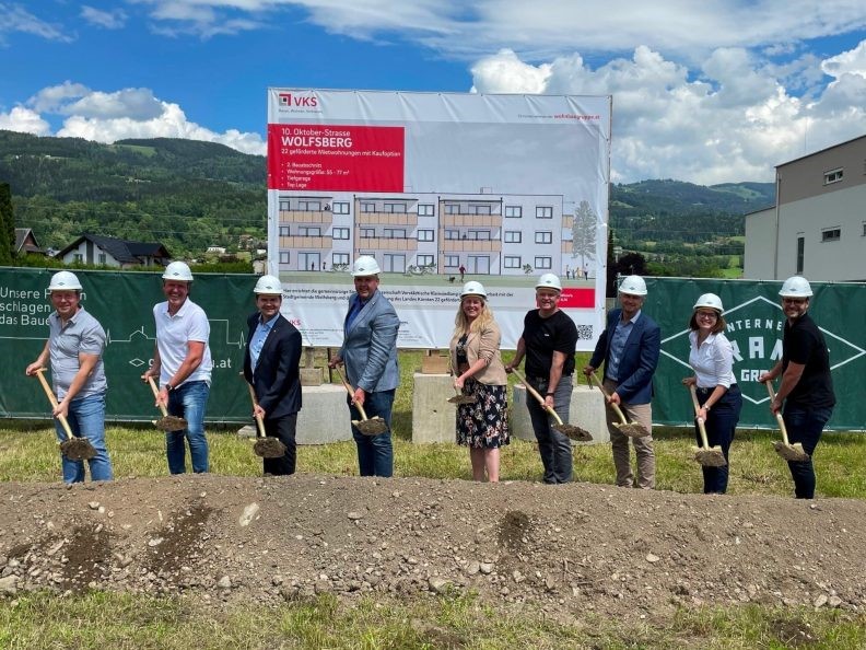 Kürzlich fiel der Startschuss für ein neues Wohnbauprojekt der VORSTÄDTISCHEN KLEINSIEDLUNGSGENOSSENSCHAFT. In zentraler Nähe mit ausgezeichneten Verkehrsanbindungen entsteht bis Winter 2023 eine Wohnanlage mit 22 barrierefreien Wohnungen. "Es ist immer ein guter Tag, wenn der Baustart für ein neues Projekt erfolgt", so Bürgermeister Hannes Primus bei der Spatenstichfeier. Weitere Festgäste beim Spatenstich waren Abgeordnete zum Kärntner Landtag Claudia Arpa, Vorstandsobmann der VKS Thomas Kuschnig, Vorstandsmitglied der VKS Gerlinde Peyker, Bauleiter der VKS Josef Wieser sowie Architekt Heinz Petschenig, Michael Rumpl und Werner Sternat von der Bauunternehmung Granit.