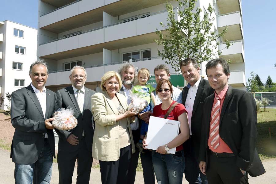 64 Wohneinheiten wurden auf dem ehemaligen ASK-Fußballplatz in der Ebentaler Straße gegenüber dem Schulzentrum St. Peter von der gemeinnützigen Wohnbaugenossenschaft „Fortschritt“ errichtet, die auch die Verwaltung der Gebäude übernehmen wird. Bei der Schlüsselübergabe der ersten 38 Wohnungen sprach Bürgermeisterin Mathiaschitz den Fortschritt-Direktoren Franz Armbrust und Wolfram Stöby sowie Baumeister Ing. Erich Schöffmann besonderen Dank aus.