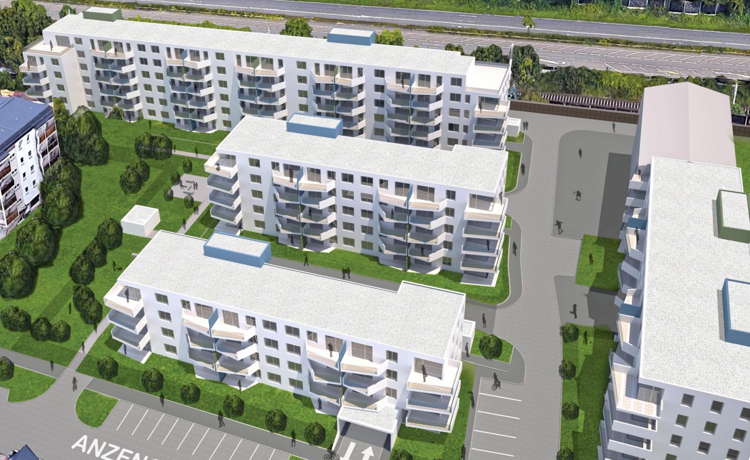 Die bestehende Ost- Westausrichtung der Grundrisse wird bei drei Baukörpern durch eine Nord – Süd Ausrichtung ersetzt, wodurch sich zukünftig die neuen Wohnungen fast gänzlich nach Süden ausrichten. Durch die 90 Grad Drehung der Baukörper kommt es für die Mieterinnen und Mieter zu einer Verringerung der Lärmbelastung durch die im Norden verlaufende Straße und Eisenbahnstrecke. Auf den freiwerdenden Flächen entstehen zukünftig 48 Pkw-Abstellflächen, Grünanlagen und Kinderspielplätze.