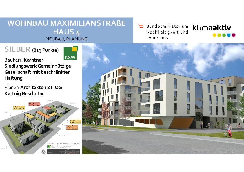 Wie bereits zu Baubeginn berichtet, errichtet das Kärntner Siedlungswerk (KSW) in der Maximilianstraße, Klagenfurt in drei Bauabschnitten insgesamt 148 Wohneinheiten. Durch die Aufteilung und geschickte Platzierung der Baukörper entsteht eine Parklandschaft mit fließenden Übergängen zwischen halböffentlichen und privaten Zonen mit Plätzen sowie Begegnungszonen. In Kürze wird Haus 4 des nachhaltigen Projekts fertiggestellt. Neben grünem Strom glänzt das Wohnprojekt auch mit einer intelligenten Abfallentsorgung. Weiters sind betreubare Wohnungen vorgesehen.