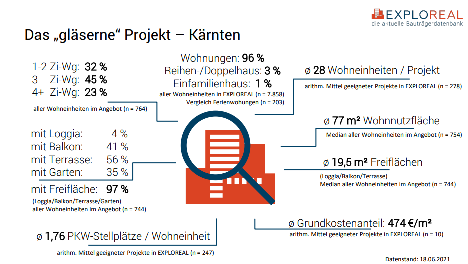 Wie bei allen bisherigen Studien wurde zunächst aus rund 280 ausgewerteten Projekte das „gläserne Projekt“ erstellt. In Kärnten gibt es im Durchschnitt 28 Wohneinheiten pro Wohnbauprojekt im Vergleich zu 34 Wohneinheiten in der Steiermark. Mit 77 m2 Wohnnutzfläche im Durchschnitt liegt Kärnten nicht nur vor der Steiermark (65,7 m2), sondern ist unter allen bisher untersuchten Bundesländern nur knapp hinter Niederösterreich an zweiter Stelle. In Niederösterreich können sich die Bewohnerinnen und Bewohner sogar über durchschnittlich 80 m2 Wohnnutzfläche freuen.