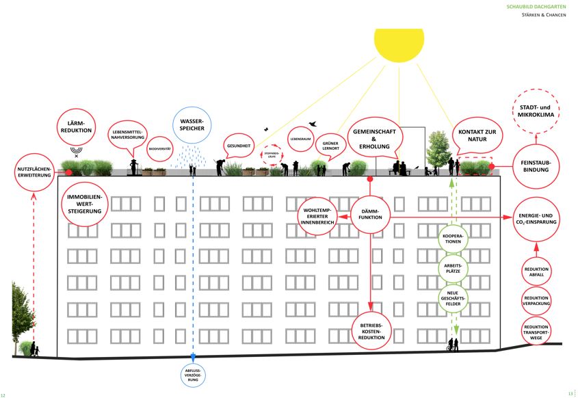 Der anhaltende Trend zur Versiegelung führt zu einem Verlust der urbanen Vegetation, die durch Verdunstung, Regenwasserrückhalt, Beschattung, Speicherung und Versickerung zahlreiche positive stadtklimatische Effekte aufweist. Die Verlagerung der Vegetation auf die bisher kaum genutzte Dachebene stellt daher eine geeignete Strategie dar, um die negativen Auswirkungen der Versiegelung zu mildern. Generell sind gebäudegebundene Begrünungsformen in dichten Siedlungsgebieten eine interessante Erweiterung zu Grünflächen in der Erdgeschoßzone, da sie zusätzliche Nutzungsweisen ermöglichen, welche die zunehmende Flächenversieglung und Flächenkonkurrenz abmildern. Neue Konzepte zur urbanen Landwirtschaft mit innovativen Bauwerksbegrünungen spielen weltweit eine immer größere Rolle. Unter den vielfältigen teilweise geschlossenen Ausführungsarten gibt es auch aufwändige offene agrarische Dachflächengestaltungen, die zusätzlich positive Effekte auf das Stadtklima haben. Neben den ökologischen und ökonomischen Überlegungen werden bei aktuellen Umsetzungen im Wohnbau vor allem soziale Funktionen berücksichtigt. Im direkten Wohnumfeld sind Dach- und Gemeinschaftsgärten wichtige Orte der Begegnung und Integration. Sie haben eine große Anziehungskraft auf alle Altersgruppen und die gemeinsame Beschäftigung mit gärtnerischen Aktivitäten begünstigt das gegenseitige Kennenlernen. Dies fördert die Identifikation der Bewohner:innen mit ihrem Wohnumfeld, wodurch nachbarschaftliche Solidarität gestärkt, gesellschaftliche Mitwirkung ausgebaut, sowie Ausgrenzung und Diskriminierung vermieden werden können.