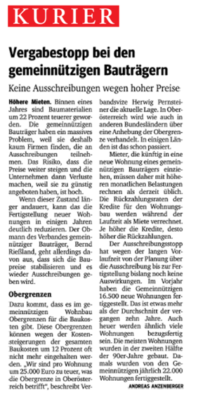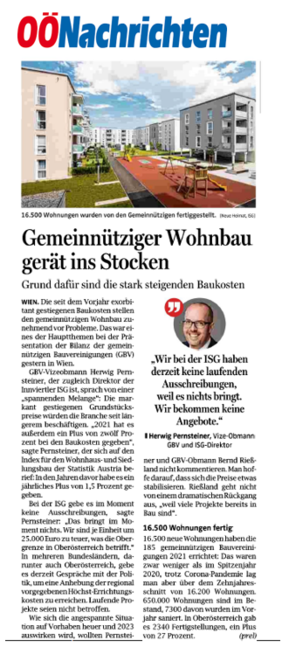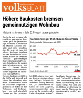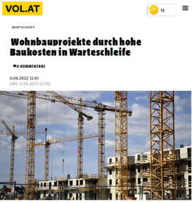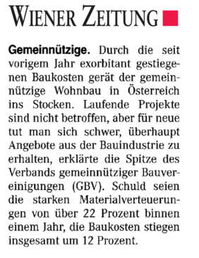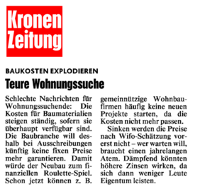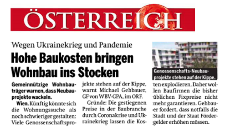 Neben den weiterhin hohen Rohstoffkosten erweisen sich die Baupreise aktuell als unkalkulierbar. Angebote gelten immer kürzer oder sind teils gar nicht zu bekommen. Wie sich diese Kostensteigerungen langfristig auf die Produktion von leistbaren Wohnungen auswirkt, ist noch offen. In einigen Bundesländern mussten jedoch bereits Projekte gestoppt werden.