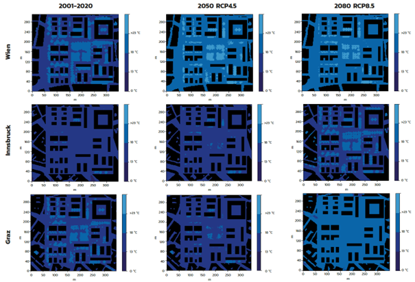 Auf dieser Basis werden neun unterschiedliche Bebauungsstrukturen mit Versiegelungsgraden von 38 bis 90 % kreiert und in einem Cluster zusammengestellt. Der Cluster wird in zentraler Lage in Wien, Graz und Innsbruck situiert und im jeweils zu erwartenden Stadtklima unter den Randbedingungen einer fünftägigen Hitzewelle einer thermischen Simulation unterzogen.