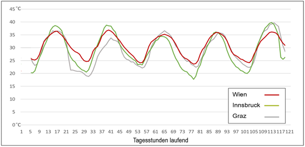 Es zeigen sich hier sehr deutliche Unterschied zwischen den Städten mit klaren Folgen für die Möglichkeiten der Lufttemperierung im Gebäudeinneren. So kann man im folgenden Diagramm den Verlauf der Lufttemperatur im Außenraum während der fünftägigen Hitzewelle im Jahr 2080 mit ungebremster Treibhausgasemission für Wien, Graz und Innsbruck ablesen.
