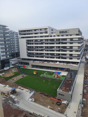 Die Wohnanlage der GESIBA, geplant von KönigLarch Architekten, umfasst 88 geförderte Mietwohnungen, 45 SMART-Wohnungen und ein Wohnheim für Alleinerziehende mit 7 Heimeinheiten und 26 Heimplätzen. Diese 7 Wohngemeinschaften bieten Alleinerziehenden mit ihren Kindern kurzfristig und flexibel eine Unterkunft. Jedes Geschoß stellt eine eigene WG dar, bestehend aus unterschiedlich großen Zimmereinheiten, einer großen Küche und einem Wohnzimmer, die von den Bewohnerinnen und Bewohnern gemeinsam genutzt werden. Zusätzlich gibt es in jedem Geschoß einen kleinen Mehrzweckraum, der je nach Bedarf als Lern- oder Spielzimmer zur Verfügung steht. In dieser Anlage befinden sich auch ein Kindergarten und ein eigenes Hausbetreuungszentrum. Rekordverdächtig sind die 566 Fahrradabstellplätze, die den 92 Garagenstellplätzen gegenüberstehen.