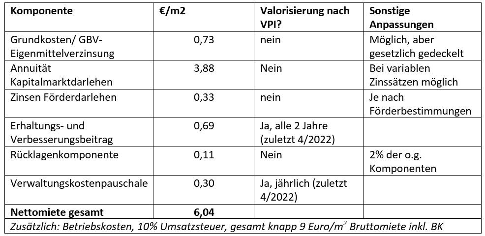 Wie oben gezeigt, sind derzeit die GBV-Mietwohnungen wesentlich schwächer von der Teuerung betroffen als andere Sektoren. Der Hauptgrund dafür ist, dass die Mietpreisbildung bei GBV weit überwiegend nach dem Prinzip der Kostenmiete erfolgt, und diese ist nicht bzw. nur in kleinen Teilkomponenten indexbasiert, wie das folgende Beispiel zeigt: