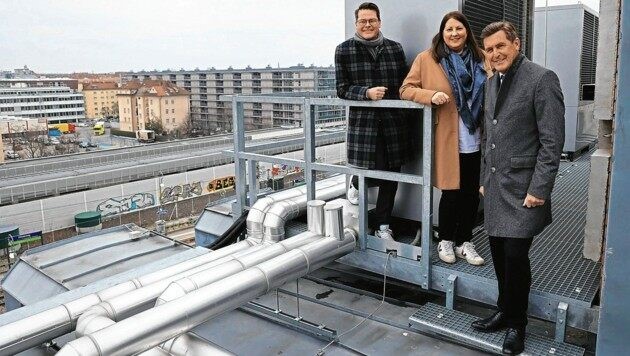 Jürgen Czernohorszky, Kathrin Gaál und Peter Hanke waren Vor-Ort, um die neue Wärmepumpe auf dem Dach zu inspizieren. © Zwefo