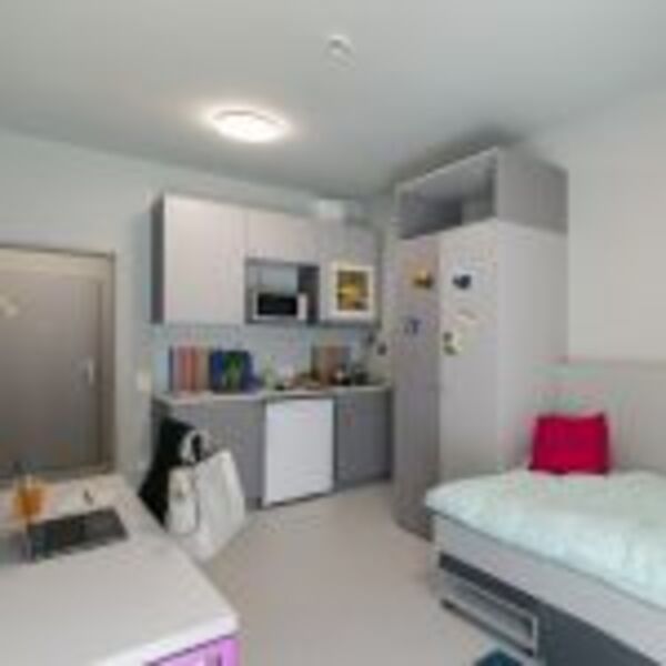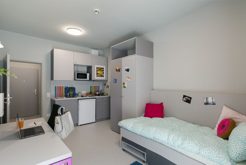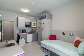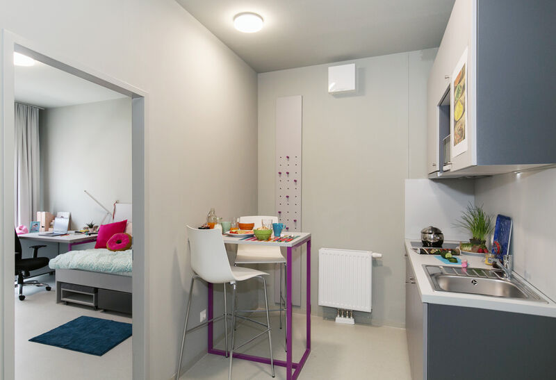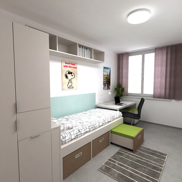 Im Oktober 2018 eröffneten in Wien gleich zwei Studentenheime der STUWO. An der Triester Straße erwarten die Studierenden auf vier Etagen 285 nagelneue Wohnheimplätze - vorwiegend Einzelzimmer im Zweier-Appartement. Die komplett möblierten Wohneinheiten - jeweils mit integrierter Kleinküche im Vorraum, Badezimmer mit Dusche und WC haben bereits die Kosten für Strom, Kabel-TV, Internet sowie die regelmäßige Reinigung der Appartements im Preis inkludiert. Als Extras stehen eine frei benutzbare Saunalandschaft, ein Fitnessraum und ein Musikübungsraum zur Verfügung.