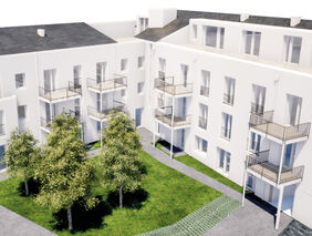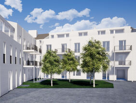 Die hofseitige Fassade wird großzügig geöffnet und es werden Balkone vor die Wohnzimmer gesetzt. Zum Garten öffnen sich die Dachgeschoßwohnungen mit großzügigen Terrassen. Aufzug, Abstellplätze im Innenhof und eine Fußbodenheizung und eine Kühlung vervollständigen den Wohnkomfort. {cwgallery}