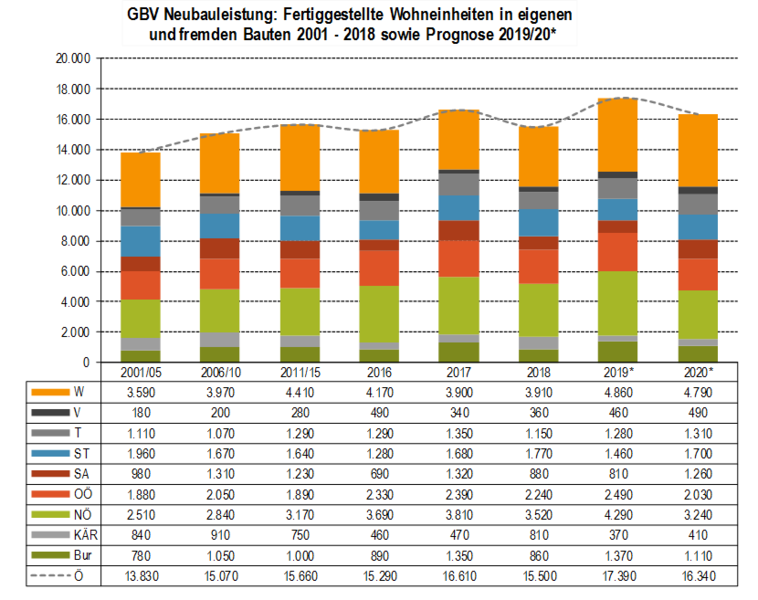 Die Zahl der in Bau befindlichen Wohnungen erreicht aktuell einen Langzeit-Rekordwert: Anfang 2019 waren 33.600 GBV-Wohnungen in Bau, diese Höhe wurde zuletzt Mitte der 1990er Jahre erreicht. Die sehr hohe Bauaktivität wird sich in den kommenden Jahren auch in überdurchschnittlichen Fertigstellungen niederschlagen. „2019 und 2020 werden im Schnitt voraussichtlich mehr als 16.500 Wohnungen übergeben werden, aus heutiger Sicht dürfte dann 2020 der Höhepunkt überschritten sein“, so Karl Wurm.