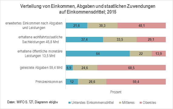 In Hinblick auf die Verteilung der Einkommen bestehen die wesentlichsten Effekte darin, dass die Einkommenssituation nach Abgaben und öffentlichen Leistungen deutlich ausgeglichener ist – und das hauptsächlich durch einen „Abtausch“ zwischen unterstem und oberstem Einkommensdrittel; die mittleren Einkommen zahlen nahezu soviel an Steuern und Sozialabgaben, wie sie an Leistungen erhalten.