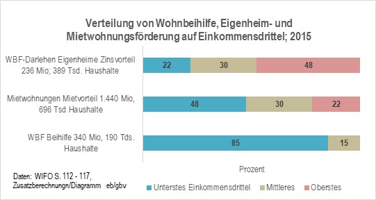 Für diese werden drei Kategorien untersucht: Die Wohnbeihilfe, die Darlehen zur Finanzierung von Eigenheimen und die Mieten in Mietwohnungen von Gemeinden und gemeinnützigen Bauvereinigungen. Dazu ist zunächst anzumerken, dass die Analyse unvollständig ist. Geförderte Eigentumswohnungen und die Sanierungsförderung bleiben ausgeblendet. Die Förderungseffekte werden bei Eigenheimen und Mietwohnungen als Zins- bzw. Mietvorteile gegenüber Marktdarlehen bzw. Marktmieten berechnet. Diesbezüglich bleibt auch kritisch anzumerken, dass damit aber nicht nur Effekte der Wohnbauförderung, sondern auch solche der Wohnungsgemeinnützigkeit (Mietenbeschränkungen) bzw. der kommunalen Mietengestaltung erfasst werden und die Leistung der öffentlichen Hand damit überbewertet ist. Die Untersuchungsergebnisse sind aber nichtsdestoweniger aufschlussreich. Bei der Wohnbeihilfe, die mit rd. 340 Mio Euro insgesamt einen geringen Anteil an den untersuchten Wohnbauförderungsleistungen hat, zeigt sich erwartungsgemäß ein starker Effekt zugunsten der niedrigen Einkommen. Wohnbeihilfen sind einkommens- und mietenabhängig und gehen damit zu gut 85 Prozent an Haushalte im untersten Einkommensdrittel. Die Mietvorteile in (geförderten) Mietwohnungen gemeinnütziger und kommunaler Träger, die insgesamt mit rd. 1,44 Milliarden Euro pro Jahr beziffert werden können, entfallen nicht ganz zur Hälfte auf das unterste Einkommensdrittel und haben damit eine quantitativ weit höhere Wirkung für Bezieherinnen und Bezieher niedrigerer Einkommen als die Beihilfe. Die Objektförderung kommt mit mehr als 20 Prozent zu einem guten Teil auch bei den höheren Einkommen (oberstes Drittel) an. Die WIFO-Studie berichtet von 44 Prozent der GBV-Mietwohnungen, die von Haushalten der oberen Einkommenshälfte bewohnt werden. Das ist ein Befund, der von Kritikern des Systems wieder einmal zum Anlass für den Ruf nach Erhöhung der sozialen Treffsicherheit genommen wurde. Diese Kritiker haben aber die WIFO-Studie nur zum Teil gelesen bzw. reflektiert. Denn dort findet sich auch die Analyse der Effekte der Eigenheimförderung – und diese ergibt, dass fast die Hälfte der Begünstigung auf das oberste Einkommensdrittel entfällt. Zwar sind hier die Effekte in Summe und auf den Einzelhaushalt umgelegt niedriger als im Mietensegment, das verdankt sich aber dem historischen Zinsentief auf den Kapitalmärkten. Unberücksichtigt bleiben auch Vermögenseffekte im Fall des Verkaufs geförderter Häuser. Weiters wurden, wie bereits angemerkt, geförderte Eigentumswohnungen nicht einbezogen, hier lassen sich ähnliche Effekte wie im Eigenheimbereich vermuten; von der Größenordnung her machen die geförderten Eigentumswohnungen etwa 50 Prozent der Eigenheime aus. Insgesamt hat die Eigentumsförderung jahrzehntelang in der Wohnbauförderung dominiert, erst seit etwa 10 bis 15 Jahren ist der Eigentumsanteil zurückgegangen. Das Gewicht der Eigentumsförderung ist daher in der WIFO-Studie unterschätzt.
