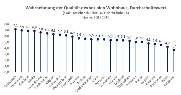 Im Vergleich zeigt sich, dass sich die unterschiedliche Ausrichtung des sozialen Wohnbaus nicht nur in der Sozialstruktur der Bewohnerinnen und Bewohner niederschlägt, sondern auch in Einstellungen und der Akzeptanz in der Bevölkerung. Generell kann man beobachten, dass es in Europa einen Zusammenhang zwischen dem Anteil des sozialen Wohnungsbestandes und dessen Wahrnehmung gibt: je höher der Anteil desto positiver die Wahrnehmung.3 Der soziale Wohnbau in Österreich nimmt nach dieser Fragestellung die Spitzenposition in Europa ein.