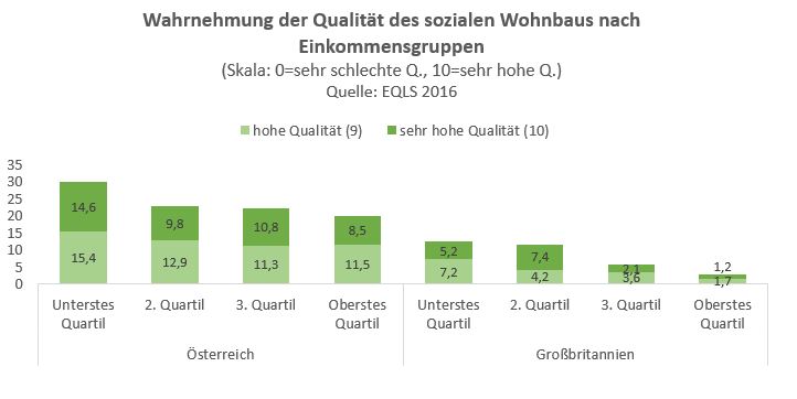 Beim Vergleich von Österreich und Großbritannien – beides Länder mit einem beträchtlichen sozialen Wohnungsbestand – wird jedoch ein wichtiger weiterer Faktor erkennbar. In Großbritannien gibt es eine große Kluft in den Einstellungen zwischen sozialen Mieterinnen und Mietern und Bewohnerinnen und Bewohnern von anderen Rechtsformen einerseits (erstere mit einer merkbar positiveren Einstellung zum sozialen Wohnbau) und zwischen Einkommensgruppen andererseits (höhere Einkommensgruppen haben eine negativere Einstellung zum sozialen Wohnbau). Nicht so in Österreich: Die Akzeptanz und die Wertschätzung des sozialen Wohnbausektors werden hier von der gesamten Gesellschaft getragen und eben nicht nur von denen, die darin wohnen (siehe Beitrag). Der soziale Wohnbau in Österreich genießt bis ins oberste Einkommensquartil eine durchwegs positive Stellung.