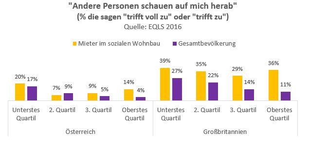 Einstellungen zur Qualität des sozialen Wohnbaus haben aber auch ganz unmittelbare Auswirkungen auf die Lebensrealität von Bewohnerinnen und Bewohnern des sozialen Wohnbaus. Auch hier zeigen sich große Unterschiede zwischen Österreich und Großbritannien. Trotz relativ hoher Wohnzufriedenheit der Bewohnerinnen und Bewohner ist sozialer Wohnbau in Großbritannien – oft verstärkt durch medial Berichterstattung – stigmatisiert, was sich in weiterer Folge auf die Selbstwahrnehmung bzw. die mentale Gesundheit der Personen auswirken kann. Eine statistische Analyse des EQLS4 zeigt, dass sich in Großbritannien Personen die von Gemeinden (local authorities) oder Gemeinnützigen (housing associations) mieten überproportional oft von der Gesellschaft ausgeschlossen fühlen bzw. das Gefühl haben, dass der Rest der Bevölkerung auf diese „herabschaut“, unabhängig von der Einkommenssituation . In Österreich hingegen spielt zwar das Einkommen eine wichtige Rolle hinsichtlich dieser Einstellungen, aber es gibt keine signifikanten Abweichungen in den unterschiedlichen Rechtsformen. Mieterin oder Mieter im sozialen Wohnbau zu sein wirkt demnach nicht stigmatisierend.