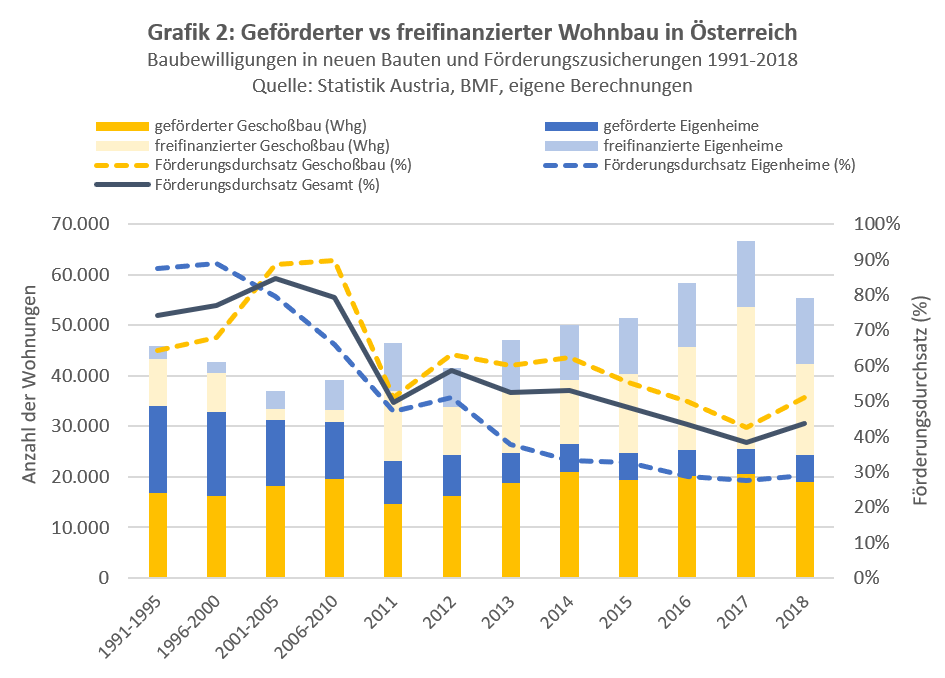 Betrachtet man die Relation von Förderungszusicherungen zu Baubewilligungen (=Förderungsdurchsatz) über die letzten Jahrzehnte, so zeigen sich vor allem zwei Entwicklungen. Zum einen sank der Förderdurchsatz bei den Eigenheimen von 87% in den frühen 1990er Jahren auf 29% im Jahr 2018. Dies ist sowohl ein Resultat des bereits erwähnten Rückgangs der Zusicherungen, aber liegt auch daran, dass die Anzahl der freifinanzierten Eigenheime seit 2010 kontinuierlich angestiegen ist. Zum anderen ist der Förderungsdurchsatz im Geschoßwohnbau seit den 1990er Jahren auch zurückgegangen, allerdings weniger rasant als bei den Eigenheimen, und zwar von 64% auf 51%. Hierfür liegt die Ursache zwar auch im Rückgang der Förderungszusicherungen aber insbesondere daran, dass der freifinanzierte Geschoßbau im letzten Jahrzehnt einen regelrechten Boom erlebt hat. Beide Faktoren erklären, warum der gesamte Förderungsdurchsatz pro Jahr von rund 75% in den 1990er Jahren auf 44% im Jahr 2018 abgesunken ist. Wichtig in diesem Zusammenhang ist auch, dass freifinanziert nicht mit profitorientiert gleichzusetzen ist. Wenn etwa gemeinnützige Bauvereinigungen aufgrund des aktuellen Zinsentiefstands am Kapitalmarkt ohne Förderung (d.h. freifinanziert) bauen, kommen trotzdem die Bestimmungen des WGG hinsichtlich Kostenmiete zur Anwendung.