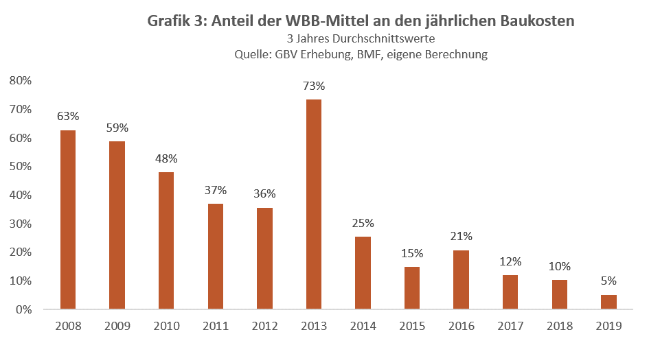 Neben den Geldern aus öffentlichen Mitteln durch die Bundesländer spielen in der Fremdfinanzierung von Neubauprojekten insbesondere auch Kapitalmarktdarlehen eine wichtige Rolle. Diese machen im Schnitt zirka ein Drittel der Gesamtkosten eines geförderten Bauprojektes aus. Das österreichische System der Wohnbaubanken bildet ein zusätzliches Instrument der Förderung des Wohnbaus, welches zinsbegünstigte Mittel auf dem Kapitalmarkt aufbringt. Über die Anleiheemissionen der Wohnbaubanken werden Mittel von Anlegern aufgenommen und in Form von Darlehen an Bauträger weitergegeben. Aufgrund der Kapitalertragssteuerbefreiung bis zu einer Verzinsung von 4% können vorteilhafte Konditionen einerseits an die Bauträger und andererseits an die Anleger weitergegeben werden. Im vergangenen Jahr erlebten die Wohnbaubanken bedingt durch die allgemeine Zinsentwicklung allerdings eine Emissionsflaute. Wurden 2008 noch rund 1,5 Mrd Euro in Form von Wohnbauanleihen emittiert, so waren es 2019 nur mehr 138 Mio Euro. Dies spiegelt sich auch in der anteiligen Deckung der Baukosten durch WBB-Mittel wieder. Stellt man die Gesamtemissionen der Wohnbaubanken den Gesamtbaukosten von (landes-) geförderten Mietwohnungen gegenüber so zeigt sich, dass 2014 noch rund ein Viertel dieser Kosten aus WBB-Darlehen finanziert werden konnte, während der Anteil 2019 auf nur 5% abgesunken ist.