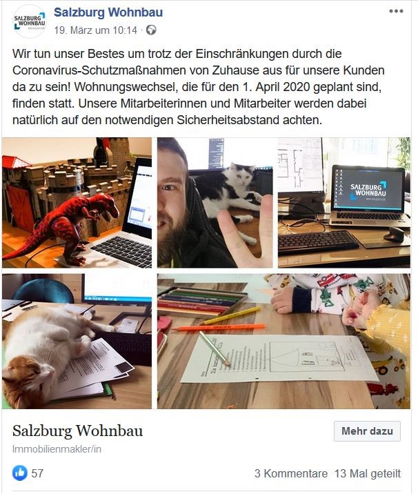 Derzeit verbringen auch viele Mitarbeiterinnen und Mitarbeiter von gemeinnützigen Bauträgern ihren Arbeitsalltag im Homeoffice. Die ideale Gelegenheit, um diese auch von ihrer persönlichen Seite kennenzulernen. Ein gutes Beispiel liefert die Salzburg Wohnbau mit einem Facebook-Post eines Mitarbeiters samt tierischen Mitbewohner. Der Aufruf, auch weiterhin auf die Wünsche und Anliegen der Kunden einzugehen, darf natürlich nicht fehlen.