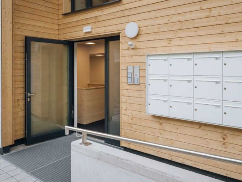 Die Wohngeschosse bestehen im Bereich der Außenwände aus gedämmter Holz-Riegel-Konstruktion mit Vorsatzschale innen und Vorsatzfassade. Die Wohnungstrennwände sind in Massivholzbauweise errichtet und die tragenden Zwischenwände bestehen aus Holz-Riegel-Elementen. Auch für die Decken und die Dachkonstruktion kam Massivholz zum Einsatz. Das Dach ist zudem mit einem Warmdachaufbau versehen und mit bituminöser, beschieferter Schwarzdeckung abgedichtet. Für die Fassade wurde eine Holz-Schalung sägerau mit Vergrauungslasur bzw. naturbelassen mit Plattenfassade verwendet. Holzinnentüren sowie Holzfenster mit 3-fach Wärmeschutzisolierverglasung komplettieren die Ausführung der Wohnanlage.