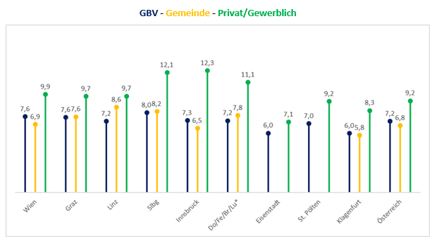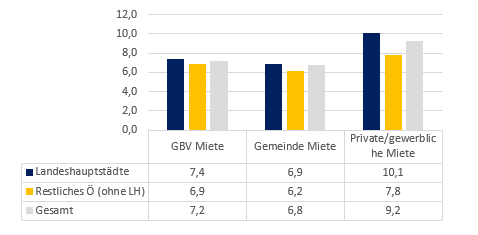 Die Entwicklung der Mieten in den urbanen Gebieten ist nicht zuletzt deswegen besonders relevant, da Haushalte in Österreichs Landeshauptstädten – wie auch in vielen anderen größeren Städten wie Hamburg, Paris oder New York – zum überwiegenden Teil Mieterstädte sind. Rund zwei Drittel (69 %) aller Haushalte in den Landeshauptstädten mieten: 31 % bei einem gewerblichen Vermieter, 23 % bei einer gemeinnützigen Bauvereinigung und 16 % bei einem kommunalen Wohnungsanbieter. Dies steht im Gegensatz zum restlichen Österreich, wo der Mieteranteil bei nur rund einem Viertel (26 %) liegt. Relativ gesehen sind allerdings GBV die wichtigsten Mietwohnungsanbieter im ländlichen Raum: jede zweite Mietwohnung außerhalb der Landeshauptstädte ist eine GBV-Wohnung.