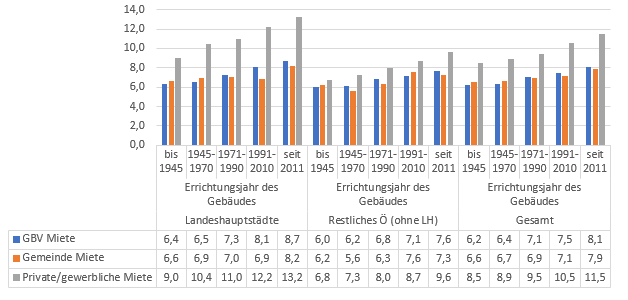 Abgesehen von den regionalen Unterschieden, zeigt sich aber auch, dass es vor allem Wohnungen in neu errichteten Gebäuden sind wo besonders hohe Mieten zu zahlen sind. Auch hier sticht der gewerbliche Sektor besonders hervor. Nach Baualter reicht die Spanne von 9 Euro/m2 bei den bis 1945 errichteten Gebäuden bis 13,2 Euro/m2 im Neubau (seit 2011 errichtet). Der niedrigere Wert vor 1945 ergibt sich aufgrund des Richtwertes nach Mietrechtsgesetz. Damit liegt die gewerbliche/private Miete im Neubau in den Landeshauptstädten mehr als 50% über der GBV-Miete. Während der Anstieg der Mieten mit Baualter (i.e. je neuer desto teurer) auch im ländlichen Gebiet zutrifft, sind die Unterschiede weniger stark ausgeprägt. Auch die Mieten bei GBVs variieren nach Gebäudealter viel schwächer als im gewerblichen/privaten Sektor. Liegt die durchschnittliche GBV-Miete (in Landeshauptstädten und in ganz Österreich) bei bis 1970 errichteten Wohnungen zwischen 6 und 6,5 Euro/m2, so sind es im Neubau (seit 2011) zwischen 7,6 im ländlichen Gebiet und 8,7 in den Landeshauptstädten. Das liegt am Wohnungsgemeinnützigkeitsgesetz. Darin ist festgelegt, dass alle Wohnungen, deren Errichtungsfinanzierung zurückgezahlt ist, zu einem maximalen Nettomietzins von derzeit rund 4 Euro zu vermieten sind. Das heißt, dass auch die heutigen Neubauten alle auf diese niedrige Miete sinken werden. Inklusive Betriebskosten und Umsatzsteuer kommt man auf rund 6,5 Euro Bruttomiete.
