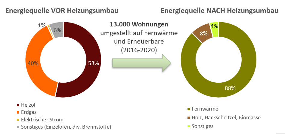 Allein in den letzten fünf Jahren (2016-2020) wurden bei rund 23.000 Wohnungen in 1.200 Gebäuden die Heizungen getauscht – in rund 60% der Fälle (750 Objekte, 13.000 Wohnungen) handelte es sich dabei um eine Umstellung des Heizsystems auf Fernwärme oder erneuerbare Energieträger. Der mit Abstand häufigste Heizungswechsel war jener von Gas- oder Öl(zentral)heizung zu Fernwärme.