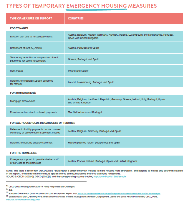 Viele europäische Länder, wie auch Österreich, reagierten mit gesetzlichen Maßnahmen auf die Krise. Delogierungsstopps wurden in 11 europäischen Ländern eingesetzt. Ergänzend gab es Maßnahmen zur Mietdeckelung wie das Einfrieren der Miete, Mietaufschub oder befristetet Mietaussetzungen. Auf Seite der Haus- und Eigentumswohnungsbesitzer setzten die europäischen Staaten sehr stark auf Kreditstundungen (AT, CZ, DE, GR, IR, IT, PT, ESP).