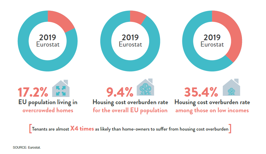 Fast 10 % der europäischen Bevölkerung sind mit den Wohnkosten überbelastet und rund 17 % leben in überbelegten Wohnungen. Diese Zahlen stammen noch dazu aus dem Jahr 2019, also vor Corona. Es ist zu befürchten, dass sich diese Indikatoren Corona-bedingt weiter verschlechtern werden. Es leuchtet ein, dass solche Wohnsituationen Homeoffice und Distance learning zu wahren Herausforderungen machen. Verschlimmert wird diese Situation durch die sich ständig drehende Preisspirale: Seit 2009 sind die Hauspreise in Europa um 30 % gestiegen, die Mieten um 15 %. Diverse andere Berichte deuten darauf hin, dass sich die Preisspirale auch dieses Jahr trotz Corona weiter nach oben drehen wird.