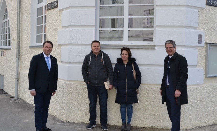 Landeshauptmann-Stellvertreter Manfred Haimbuchner (links) und Robert Oberleitner (rechts) gratulieren den neuen Mieterinnen und Mietern © Neue Heimat