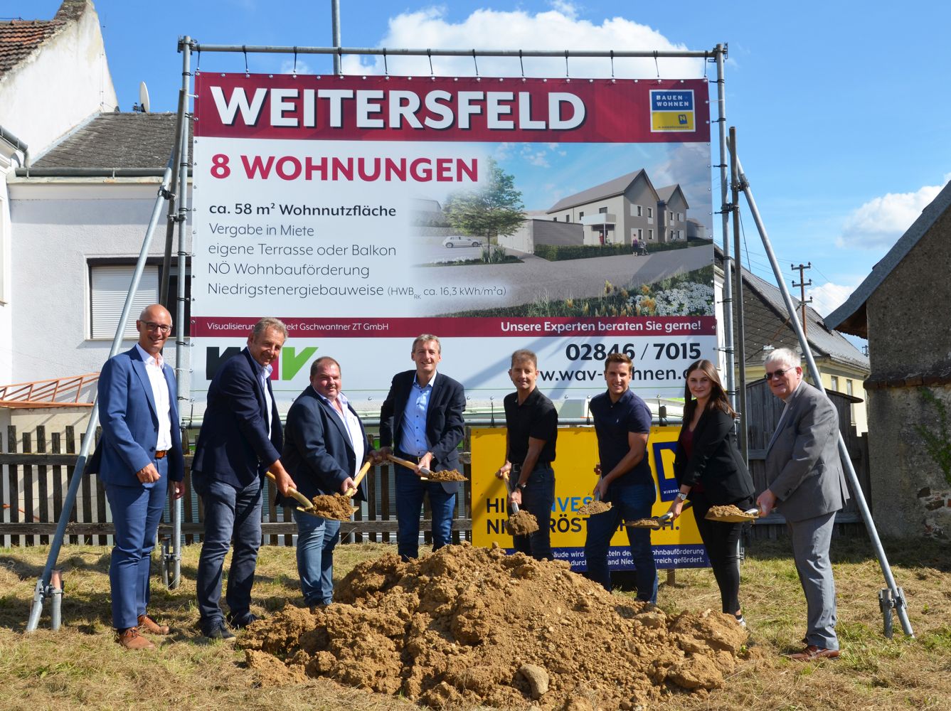 Doch die WAV baut auch weiterhin fleißig: In Weitersfeld wurde der Startschuss für eine neue Wohnhausanlage mit acht Wohnungen gesetzt. WAV-Verkaufsleiter Christian Reegen begrüßte alle Gäste des Festaktes. Bürgermeister Reinhard Nowak, der sich persönlich sehr für dieses Projekt engagiert hat, freut sich, dass mit diesem Bauvorhaben der Zuzug aufs Land unterstützt wird. Die Planung der Anlage erfolgte durch das Architekturbüro Gschwantner ZT GmbH aus Krems. Architekt Franz Gschwantner stellte das Projekt vor und betonte, dass leistbares Wohnen der Grundgedanke des Bauvorhabens ist. Da die neue Anlage mit Giebeldächern bedeckt wird, gliedern sich diese in das gegebene Ortsbild perfekt ein. So wie bei all Bauprojekten wird auch bei diesem Projekt besonders auf Energiesparen Wert gelegt, weshalb die Wohnhausanlage in Niedrigstenergie- und Holzbauweise errichtet wird. Jede Wohnung verfügt über eine Wohnnutzfläche von ca. 58 m² sowie einen privaten Freiraum in Form einer Terrasse oder eines Balkons.