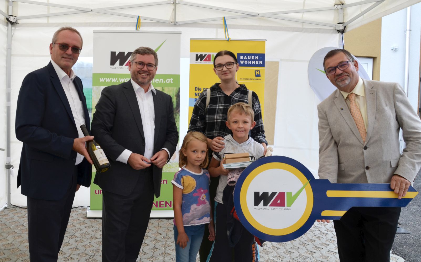 WAV-Vorstandsdirektor Manfred Damberger, Landesrat Ludwig Schleritzko, Mieterin mit Kindern, Bürgermeister Hermann Fischer © WAV