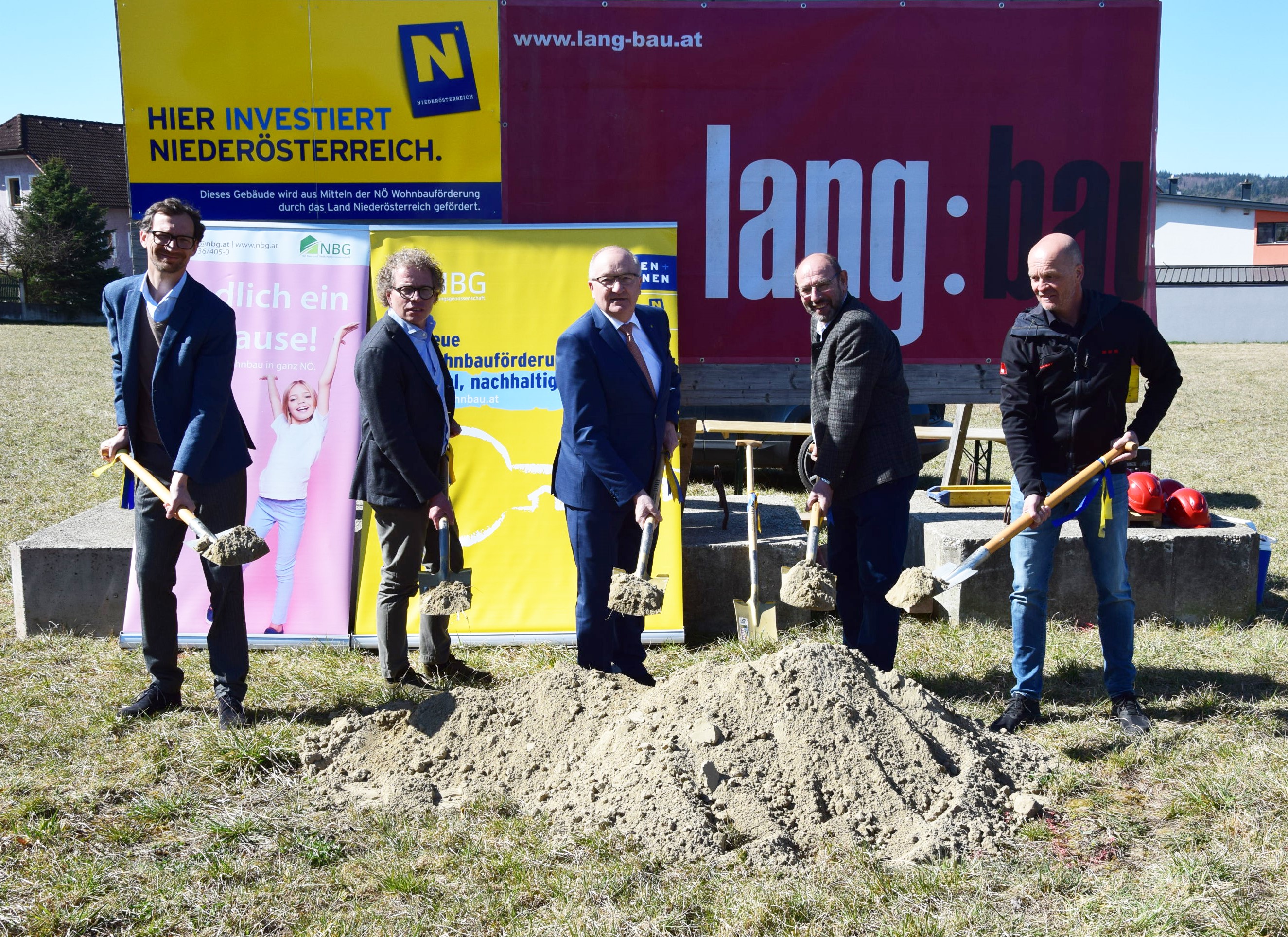 Mit Spendenübergabe und Gleichenfeiern ist es bei der NBG aber noch nicht getan, denn vor kurzem freute sich der gemeinnützige Bauträger über einen Spatenstich in Erlauf. Im Beisein von Direktor Manuel Resetarics, Geschäftsführer Wilhelm Lang, dem Zweiten Präsident des NÖ Landtages Karl Moser, Vizebürgermeister Franz Freitag und Bauleiter Hannes Neuweg fand der Startschuss für eine Wohnhausanlage mit zwölf Wohnungen, drei Reihenhäusern und einem Doppelhaus statt.