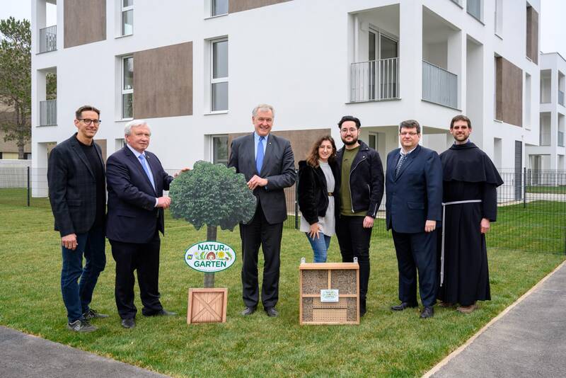 Martin Eichtinger, Christoph Scharinger, Bürgermeister Herbert Osterbauer, Pfarrer Bernhard Lang, Mieterin und Mieter © Credit G. Nesvadba, FRIEDEN