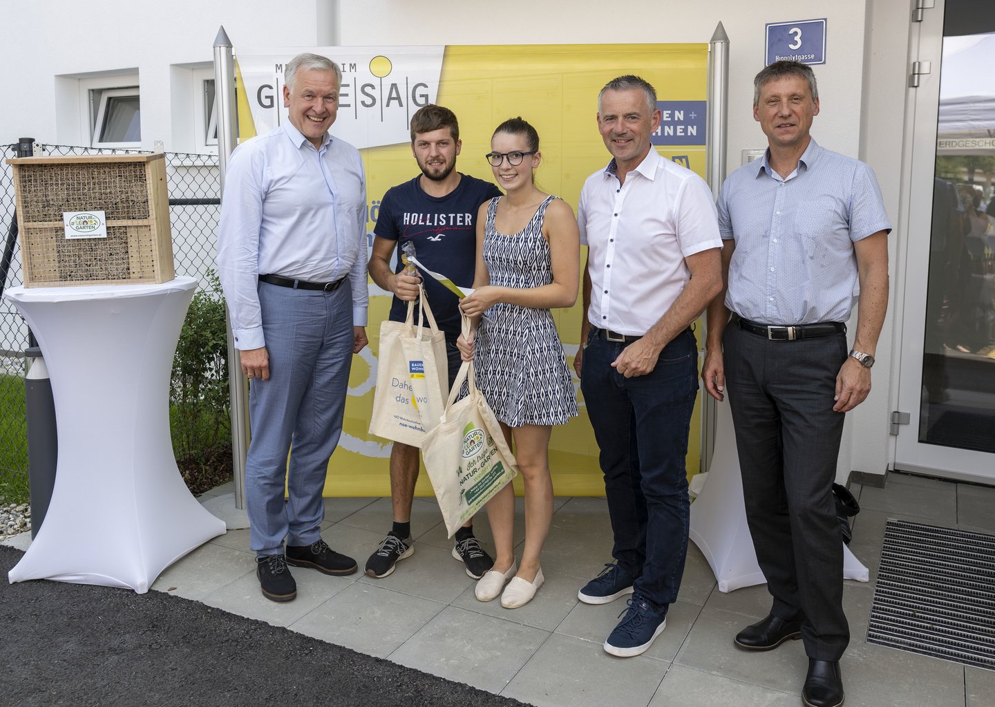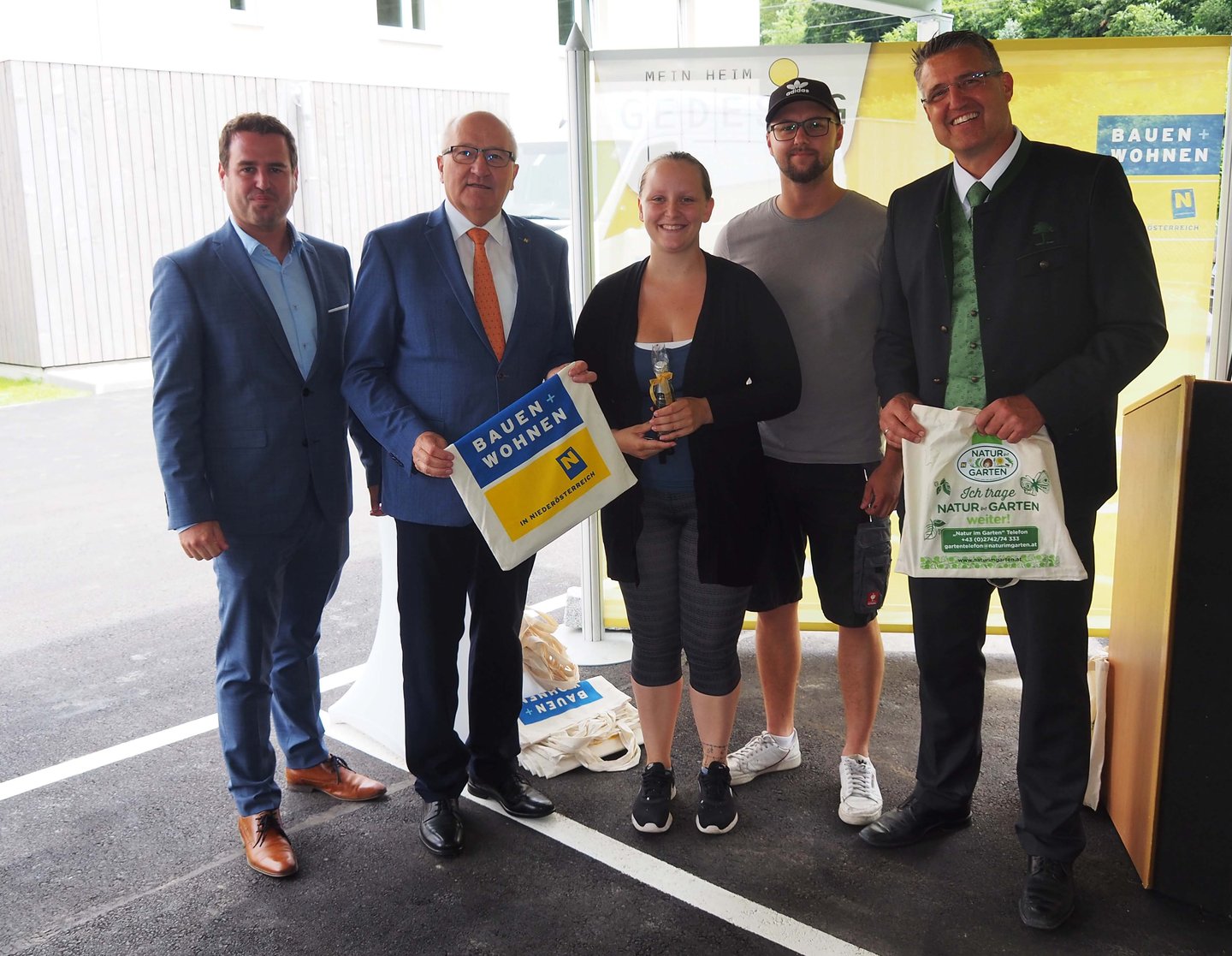 Auch in Mank erblickte man glückliche Gesichter (v.l.n.r. Wohnbau-Landesrat Martin Eichtinger, Jakob Winter und Sandra Leitner, Bürgermeister Martin Leonhardsberger, Erlefried Olearczick) © NLK Filzwieser