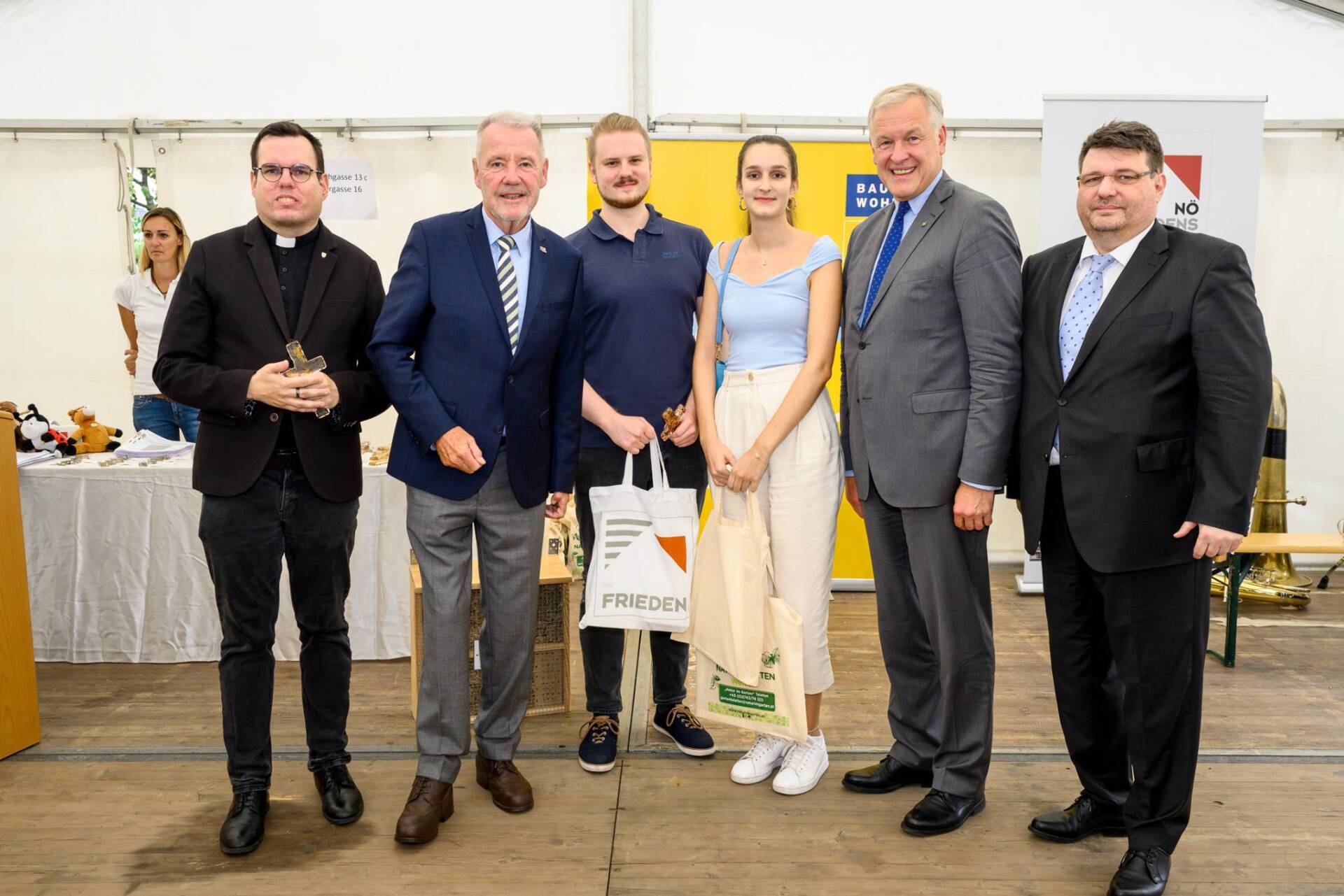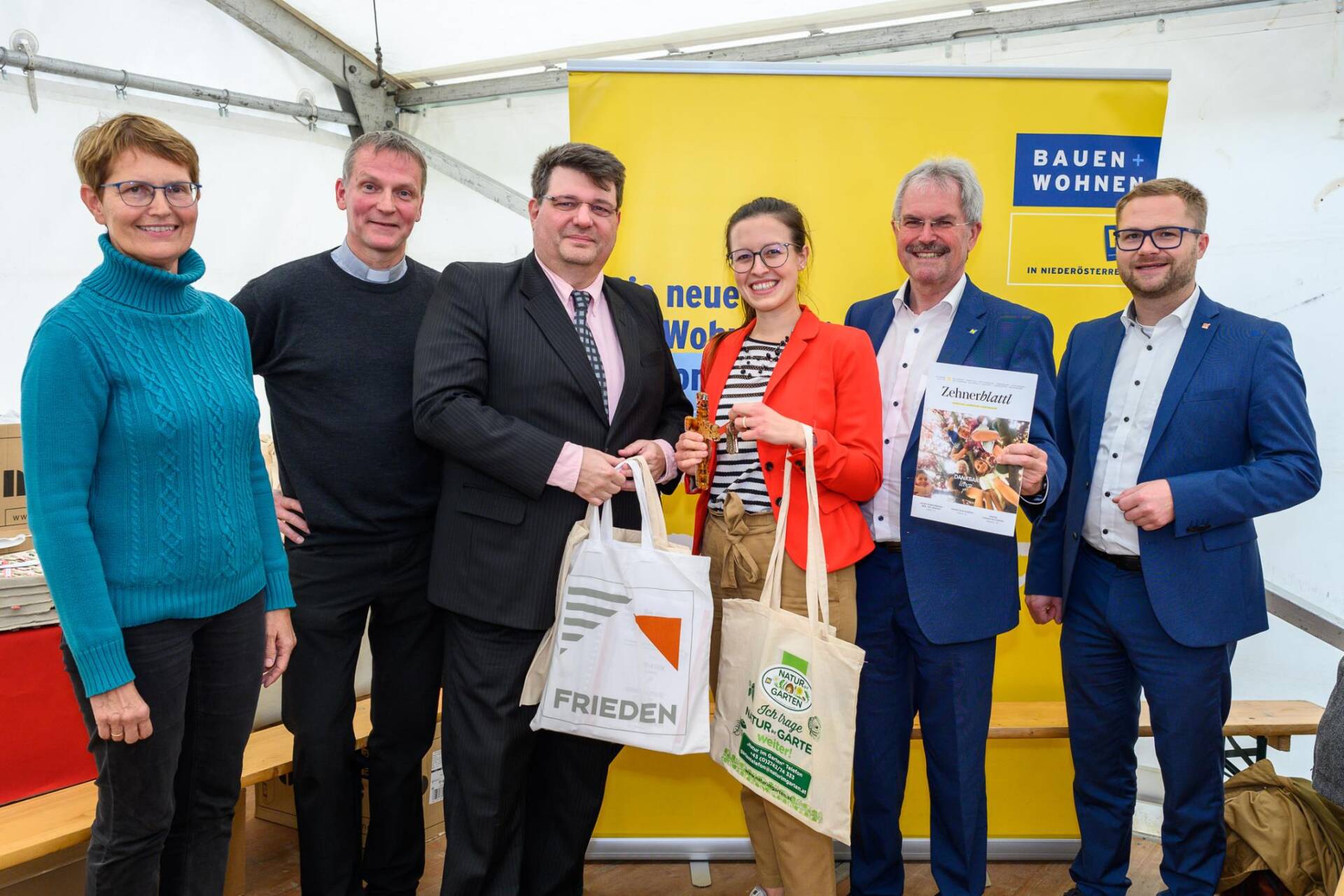 v.r.n.l.: Bgm. Erich Stubenvoll, Landtagspräsident Karl Wilfing, eine glückliche Mieterin, Christoph Scharinger (NÖ Friedenswerk), Pfarrer Johannes Cornaro und Pfarrgemeinderätin Edith Jascha © FRIEDEN