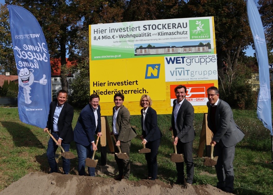 Mit dem Spatenstich in Stockerau begann die WET die thermische Sanierung des Objekts in der Schaumanngasse. In Vertretung von Landeshauptfrau Johanna Mikl-Leitner wohnte Christian Gepp, Abgeordneter zum NÖ-Landtag, diesem Ereignis bei. Auch weitere Ehrengäste wie Bürgermeisterin Andrea Völkl und Stadtrat Gerhard Dummer waren beim Spatenstich anwesend.