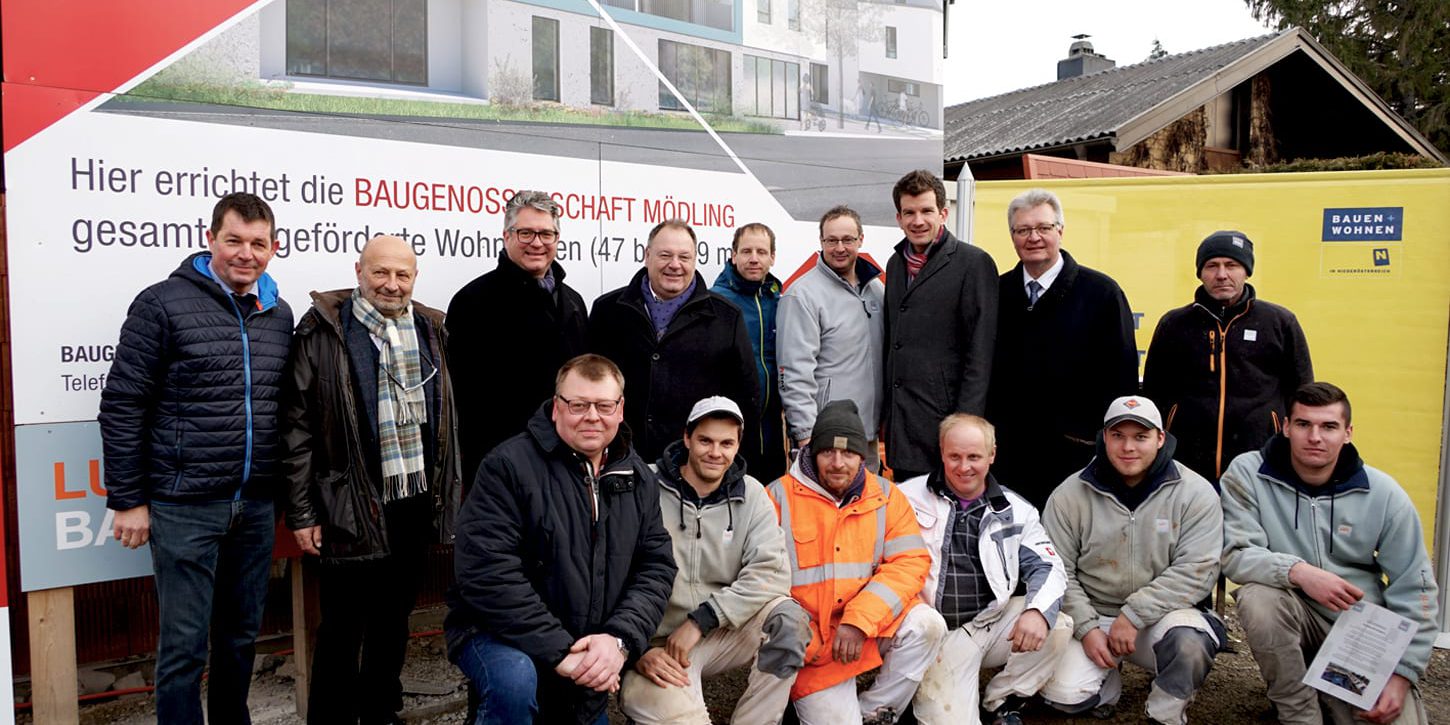 Abg. z. Landtag Christoph Kainz, Bürgermeister Christian Macho, Obmann der Baugen. KommRat Andreas Holzmann, Obmann-Stv. Robert Weber sowie Vertreter der ausführenden Firmen ©Baugenossenschaft Mödling