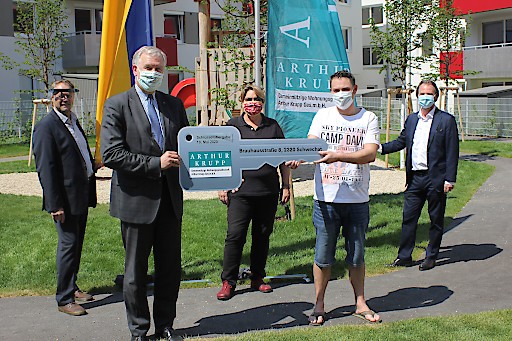 Mitte Mai wurden in der Brauhausstraße 8, in Schwechat, 91 geförderte Wohnungen von der Stadtgemeinde Schwechat und der gemeinnützigen Wohnungsgesellschaft „Arthur Krupp“ an die neuen Bewohnerinnen und Bewohner übergeben. Aufgrund der außergewöhnlichen Maßnahmen übergab Landesrat Martin Eichtinger in Vertretung von Landeshauptfrau Johanna Mikl-Leitner in einem symbolischen Akt die neue Wohnhausanlage an die Mieterinnen und Mieter. Der zweite Bauabschnitt der neuen Wohnhausanlage umfasst 91 geförderte Zwei-, Drei- und Vier-Zimmer-Wohnungen mit einer Wohnnutzfläche von 55 bis 93m2.