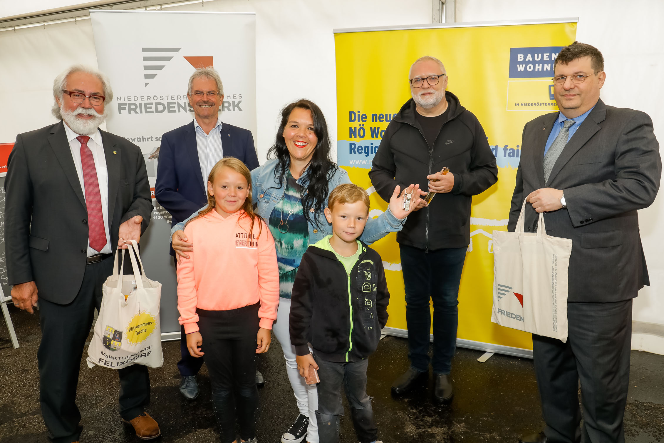 Eine Familie freut sich mit Bürgermeister Walter Kahrer (ganz links), Präsident des niederösterreichischen Landtages Karl Wilfing (hinten links), Bmst. Christoph Scharinger vom NIEDERÖSTERREICHISCHEN FRIEDENSWERK(rechts) bei der Schlüsselübergabe. © NIEDERÖSTERREICHISCHES FRIEDENSWERK