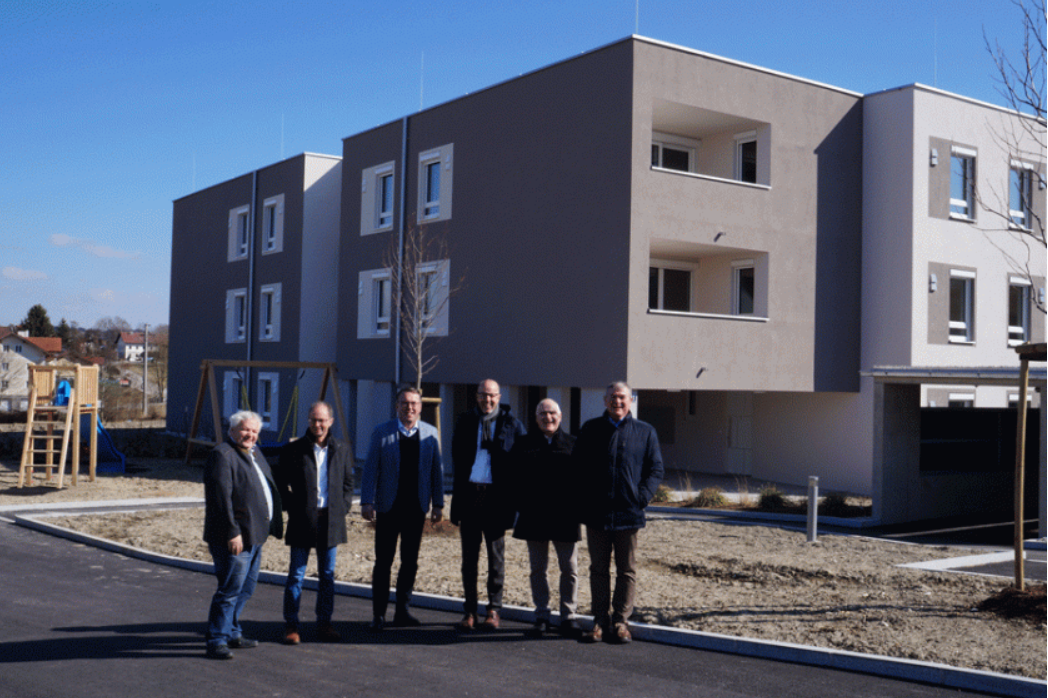 Foto v.l.n.r.: Bauleiter Erwin Atzmüller, Arch. Ernst Lindinger. LAbg. Günther Lengauer, Dir. Herwig Pernsteiner, Vbzgm. Thomas Dim und Herwig Enzinger © ISG Wohnen