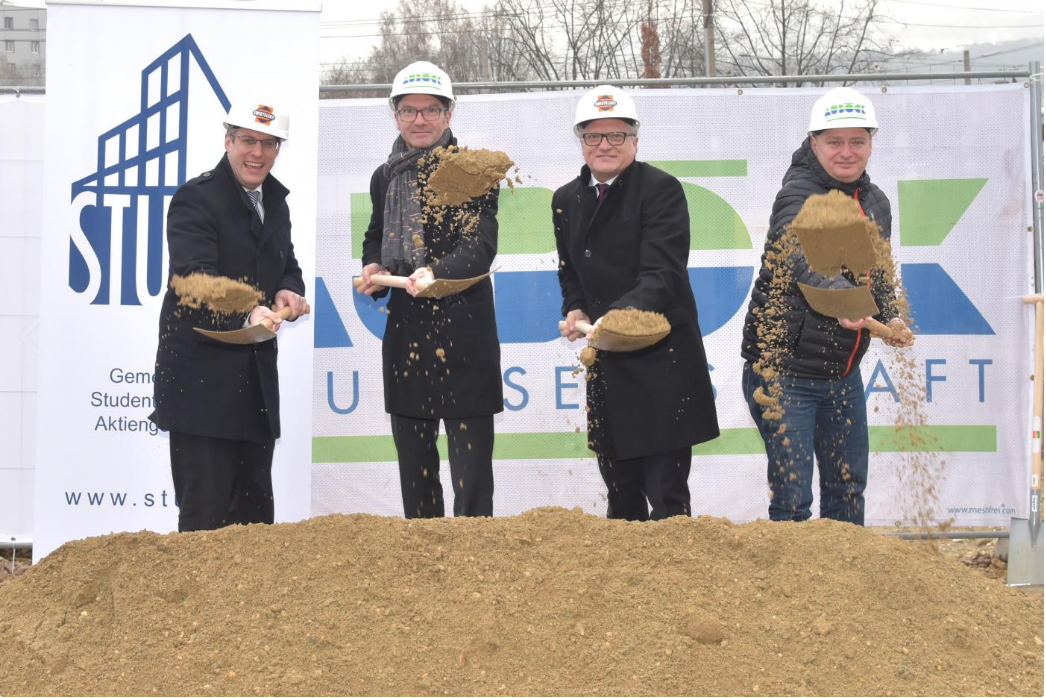 Zum Spatenstich lud GSA-Wohnbau-Geschäftsführer Christian Haidinger neben Bürgermeister Klaus Luger und Stadtrat Markus Hain auch Bauherren und Architekten in das sogenannte Uni-Viertel ein. Die zukünftigen Nutzer des Hauses, die Stuwo AG und die Oberbank, waren ebenfalls anwesend.