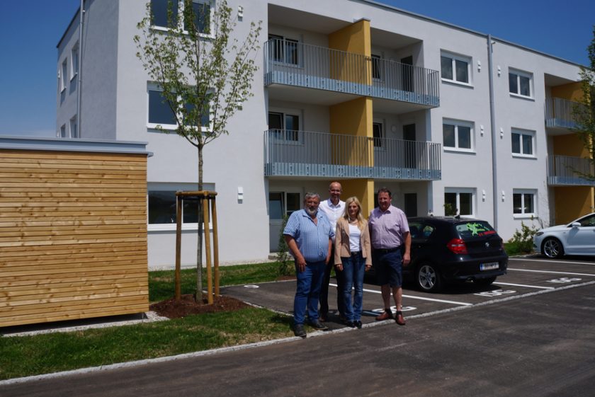 Bei der gemeinsamen Übergabefeier mit den Bewohnerinnen und Bewohnern überzeugen sich (Foto ISG v.l.n.r.) Bürgermeister Josef Leimer, Dir. DI Herwig Pernsteiner, Gabriele Neiß und Wolfgang Kirchgassner vom gelungenen Projekt.