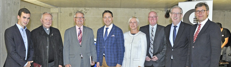 Foto: Ehrengäste bei der Schlüsselübergabe – von links: Bürgermeister Severin Mair, Stadtpfarrer Mag. Erich Weichselbaumer, Pfarrer Mag. Johannes Hanek, Wohnbaulandesrat LH-Stv. Dr. Manfred Haimbuchner, Vizebürgermeisterin Mag. Jutta Kepplinger, Stadtrat Harald Melchart, Vizebürgermeister Egolf Richter, Mag. Wolfgang Modera. Foto: GIWOG