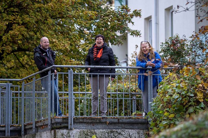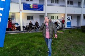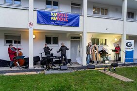 Hierfür wurden Lautsprecher in alle Richtungen aufgestellt und die Band „Fredy & die Marzipan Combo“ spielte im Freien ihre Musik für die Mieterinnen und Mieter der Wohnanlage. Dabei wurde natürlich darauf geachtet, die Corona-Sicherheitsmaßnahmen einzuhalten: Alle Bewohnerinnen und Bewohner blieben in ihren Wohnungen und konnten entweder auf ihren Balkonen oder durch geöffnete Fenster der Musik lauschen.