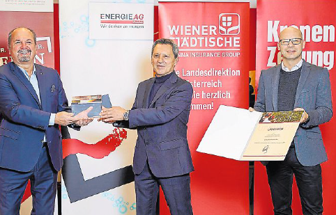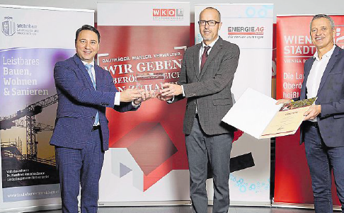 Günter Erhartmaier (links) und Andi Schwantner (rechts) von der "Kronen Zeitung" überreichen den Wohnbaupreis an Alfred Kitzwögerer von der WS-O © Markus Wenzel